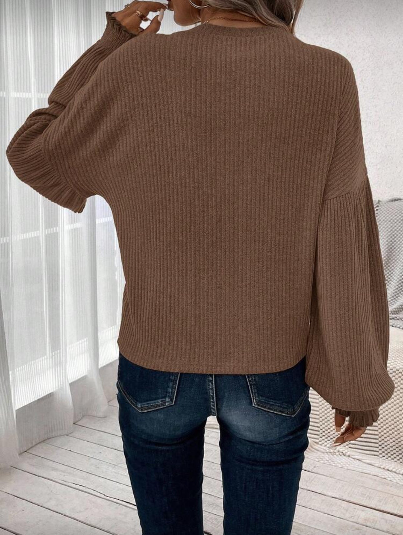 Slip into comfort with our Coffee Break Top, a soft ribbed long sleeve featuring relaxed lantern sleeves and a flattering drape. The warm brown hue makes it an easy favorite for coffee runs, cozy nights in, or layered looks on crisp days. Effortless, comfy, and made for everyday moments.